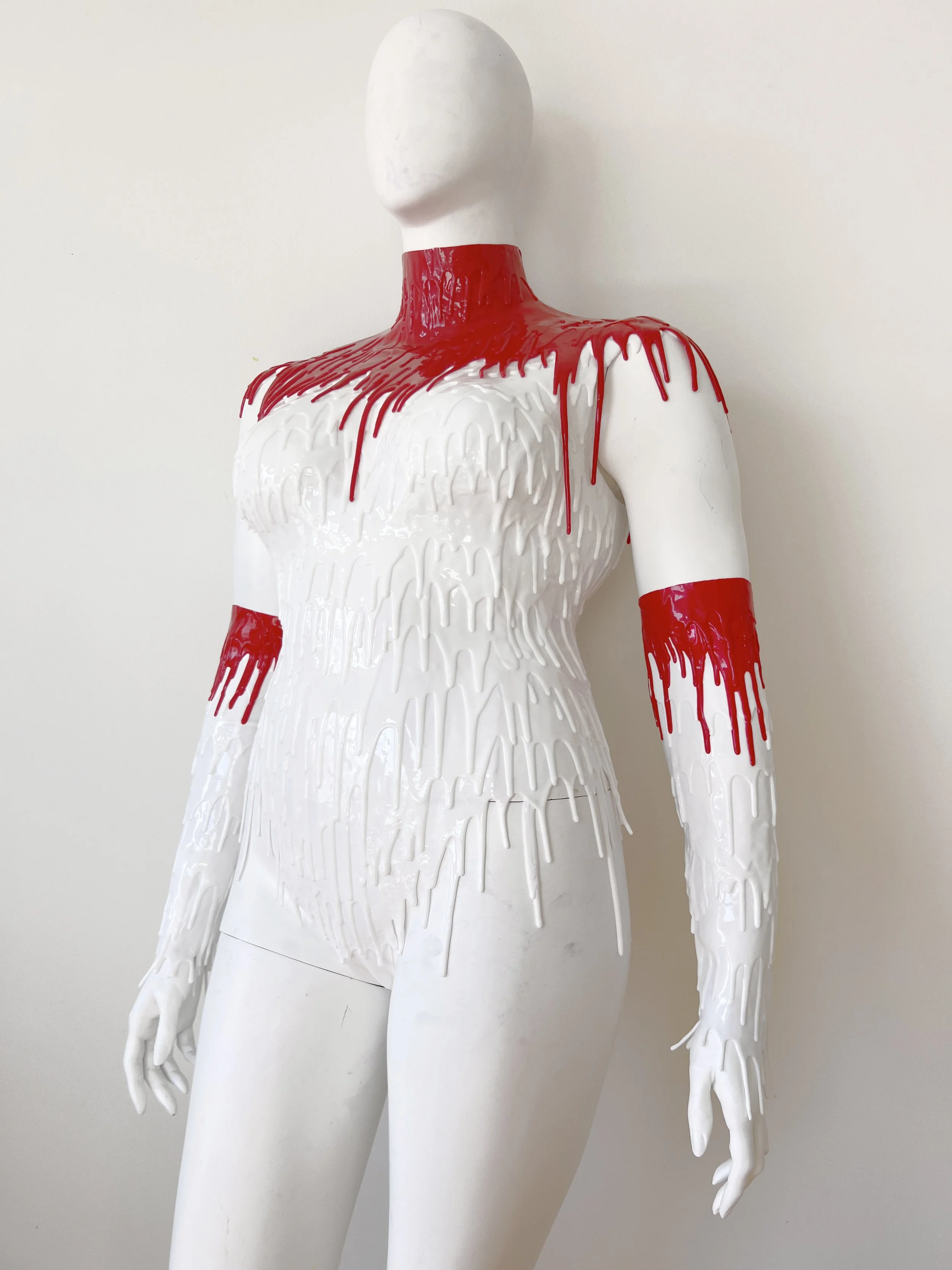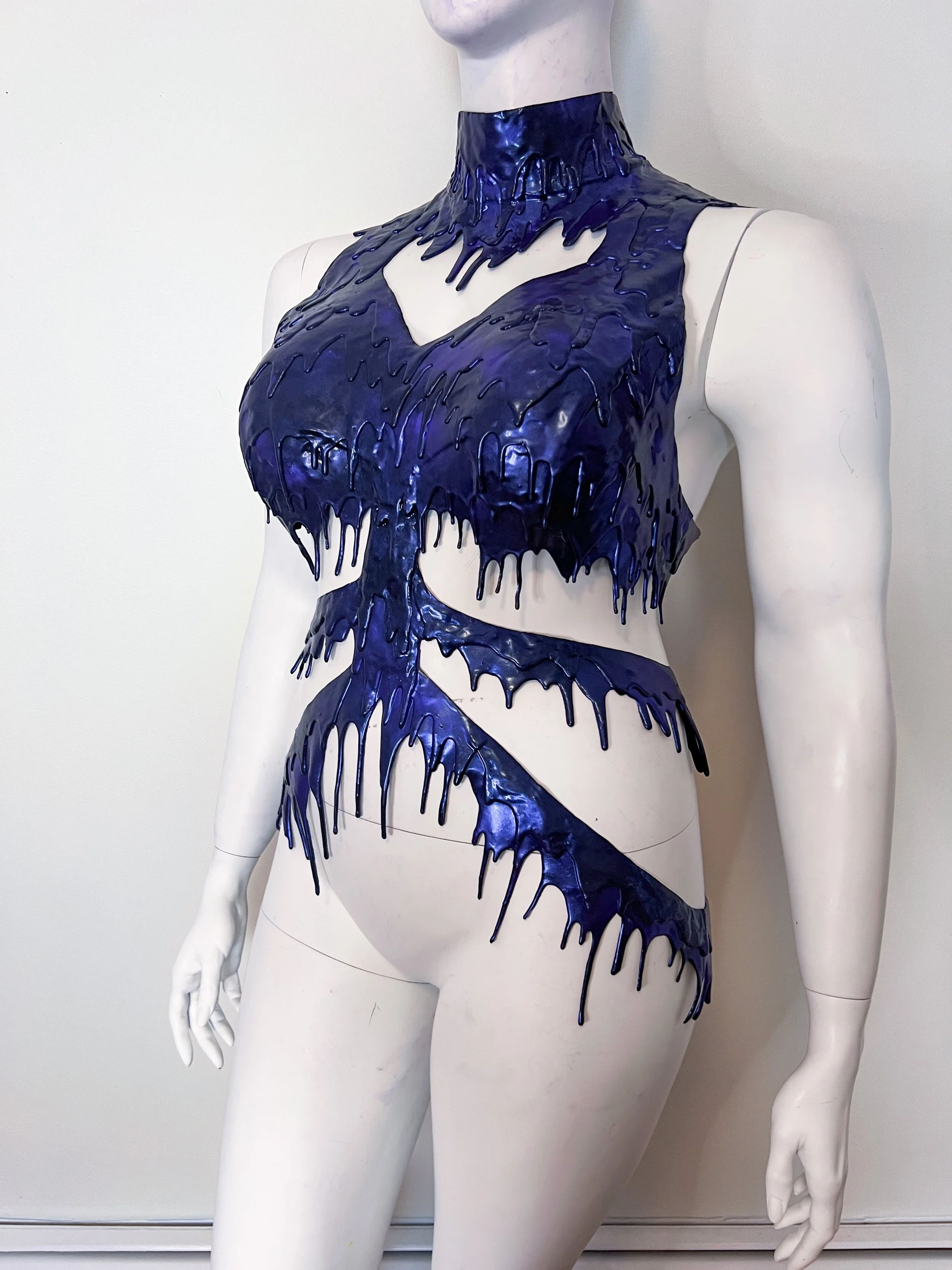 3d printed silicone arrows appliqued onto black powermesh.  High waisted with long sleeve crop top and matching drip choker.