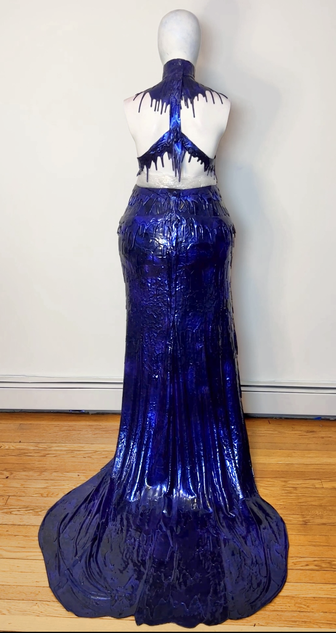 Blue to purple iridescent ombre drip halter with chain enclosure.